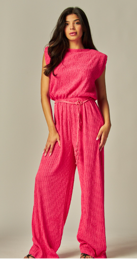 Step into the spotlight with the Pink Wonderland Crinkled Jumpsuit, featuring a playful allover crinkled plisse texture that adds fun movement to every step. The tie belt waist flatters your figure, while the back keyhole and mock neckline bring a flirty touch. Shoulder pads and a wide-leg silhouette complete this bold, stylish look perfect for making a memorable entrance. Crafted from a comfortable blend of polyester and spandex, it moves with you all day long.